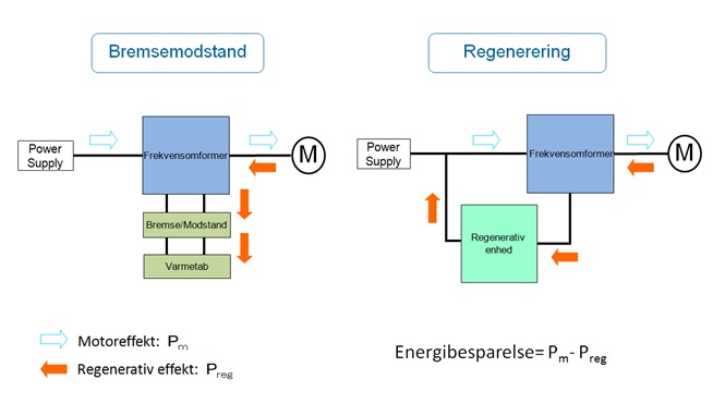 Med en regenerativ enhed, der er forbundet med elevatorens frekvensomformer, føres overskydende energi fra elevatorens motor tilbage til elnettet. Resultatet er et lavere energiforbrug. Herunder ses en principskitse.
